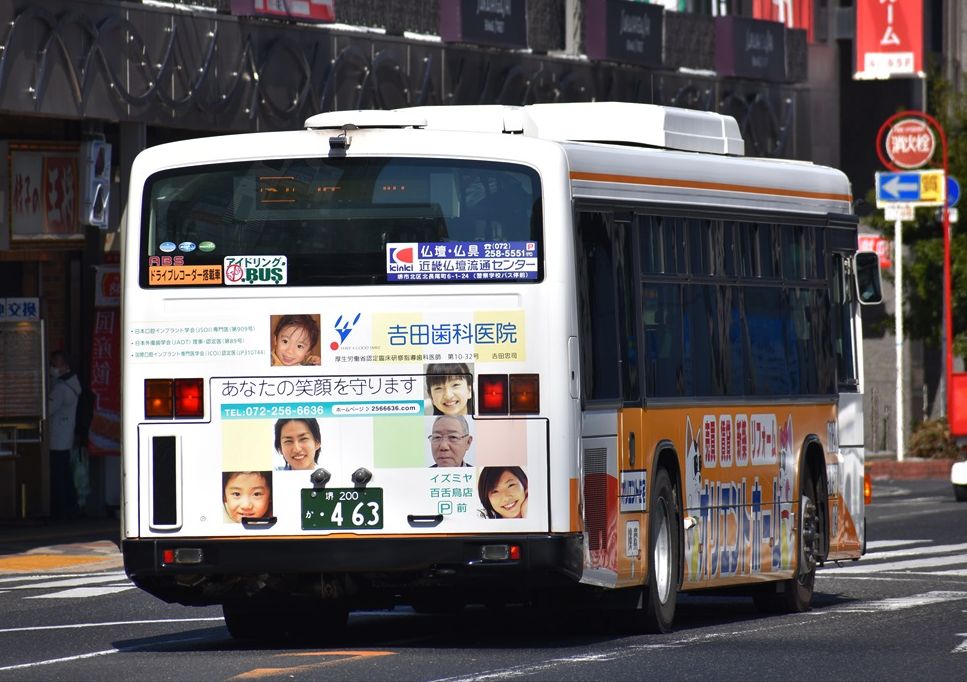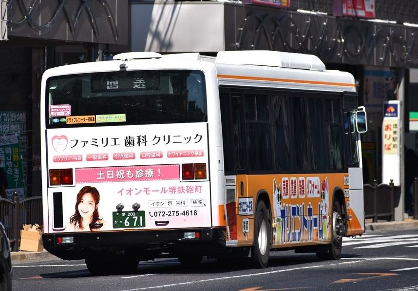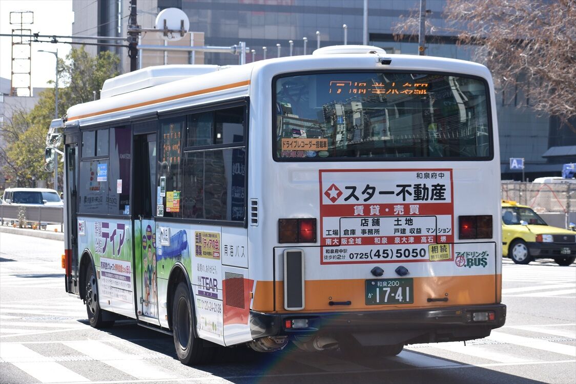南海バスでは、グループの葬儀会社「ティア」の広告バスが多数走っていますが、このデザインは初めて見ました
