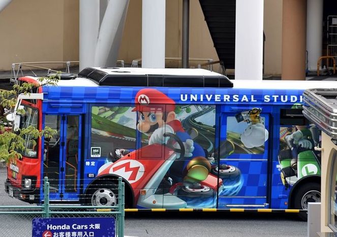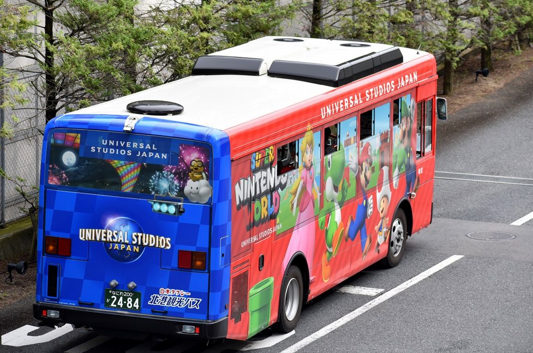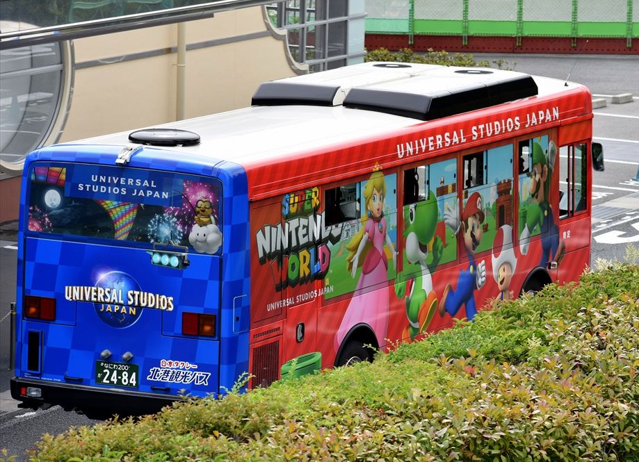 USJのパーク内従業員輸送バス、この春に新車が導入、この秋以降(当初の予定が延期されました)にオ-プンするニンテンドーの新エリアのラッピングが施されています
