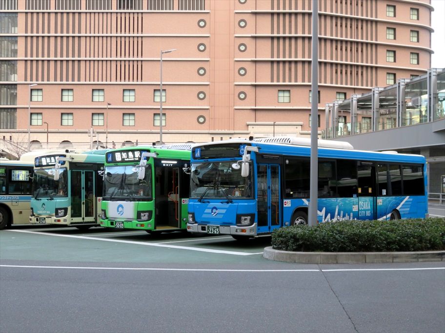 2021年01月31日 大阪シティバス新車カラー4種 カテゴリ:大阪シティバス(全ラッピング) by wrpgu 少し前に大阪駅で、新車の4種類のカラーが一堂に会しました ちょっと濃い緑の車両のタイミングが合わなかったですが 5000番台の新車導入に伴い、800番台のCNGバスが廃車、そして今月の車両移動(*)で鶴町のCNGバスは姿を消したそうです (*)1月上旬に久々に多くの車両が配置替えありましたが、1月下旬に追加で配置替えが行われたようです。つい先日掲載した、970・971のオリエントホームのラッピングバスも、結局住吉に移動したようです。
