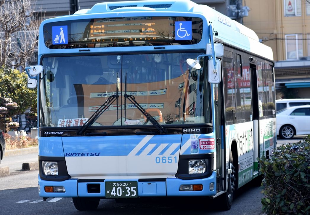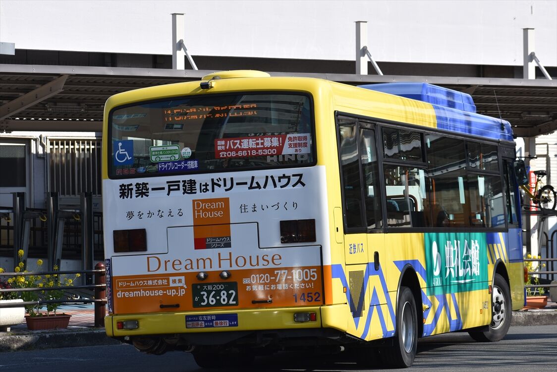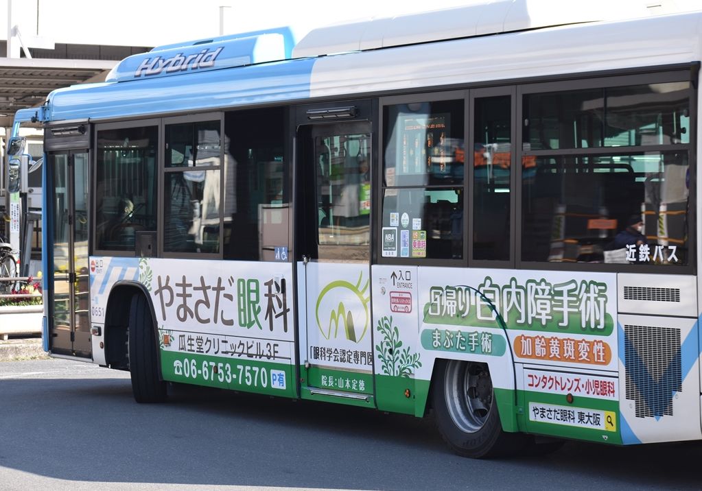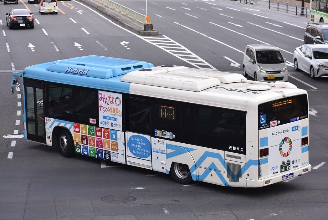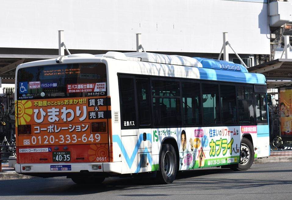 近鉄バスの数少ないハイブリッド車、布施の0653号車以外、全てに何らかのラッピングが施されています