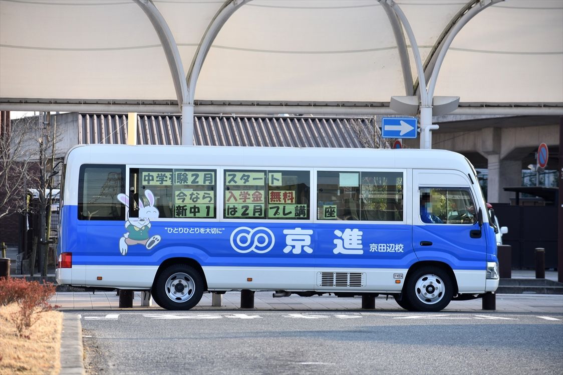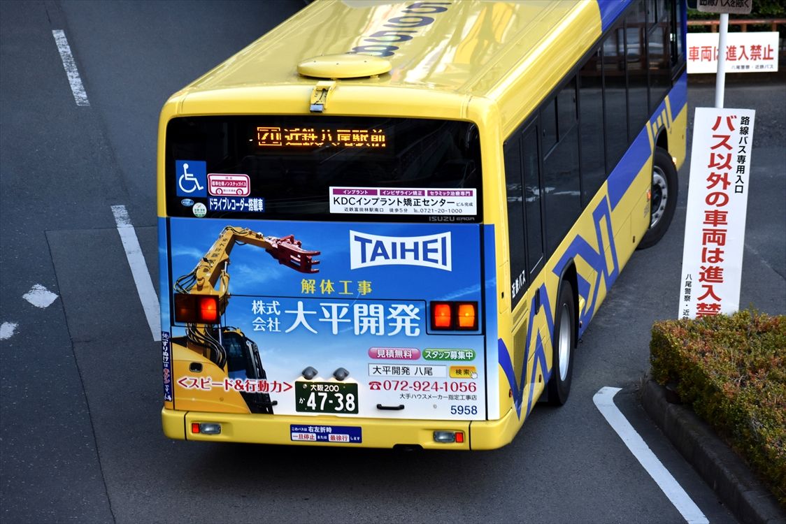 主に、八戸ノ里~近大直行バスで活躍する、稲田のハイブリッド車、少し前に左面にもラッピングがつきました