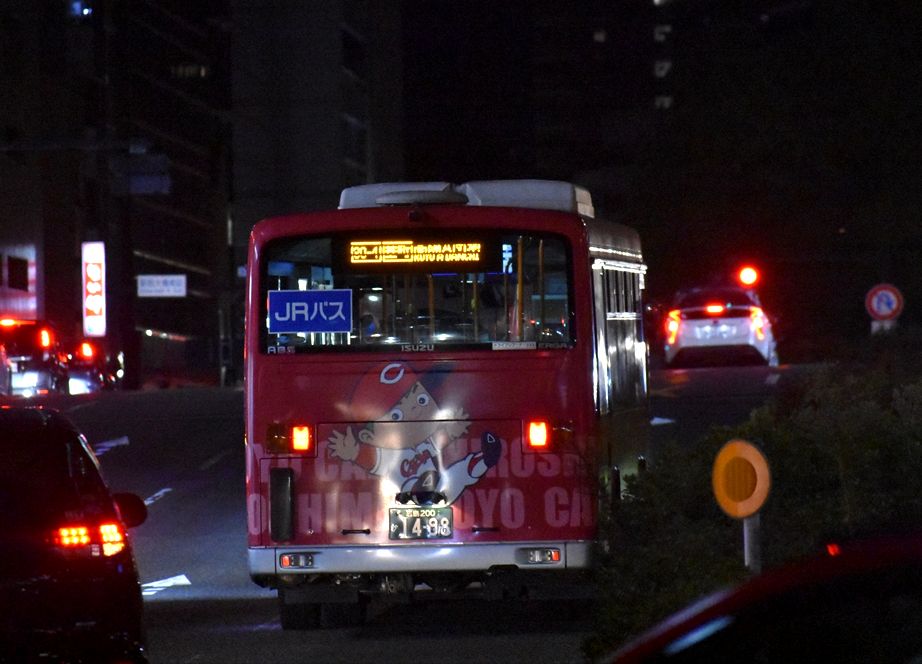 2022年01月31日 広島カープ(中国JRバス) カテゴリ:広島県 ラッピング車 by wrpgu JRバスで2016年から広島で運行されているという、広島カープのラッピングバス 初めて遭遇しました 夜の交通量の多い時間帯で、これしか撮れなかったですが・・・ おまけ:新幹線の車窓から見える、スタジアムのそばにある、ローソンのカープコラボ店