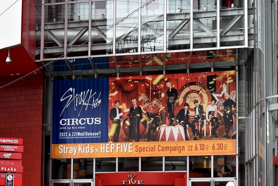 2022年06月27日 Stray Kids×HEP FIVE カテゴリ:■建物・施設へのラッピング等 by wrpgu 撮るの忘れていた、HEP FIVEのストレイキッズ(KPOP)のキャンペーン装飾 今回は観覧車へのラッピングはなく、外観と、館内の一部に装飾