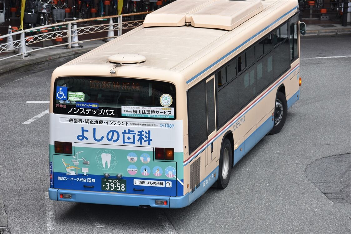2022年06月28日 ◆よしの歯科(阪急バス)1087 カテゴリ:阪急バス(神戸ナンバー) by wrpgu 伊丹営業所のよしの歯科、これまで2台見て載せていましたが、まだいました おまけ:ニチメイ不動産ラッピングバス、ドア横のステッカー広告がよく変わっています おまけ:阪急バスでも少なくなってきた、西工中型ロング車