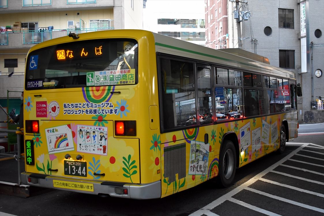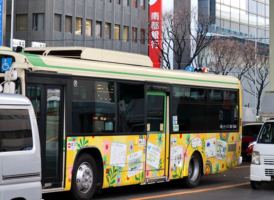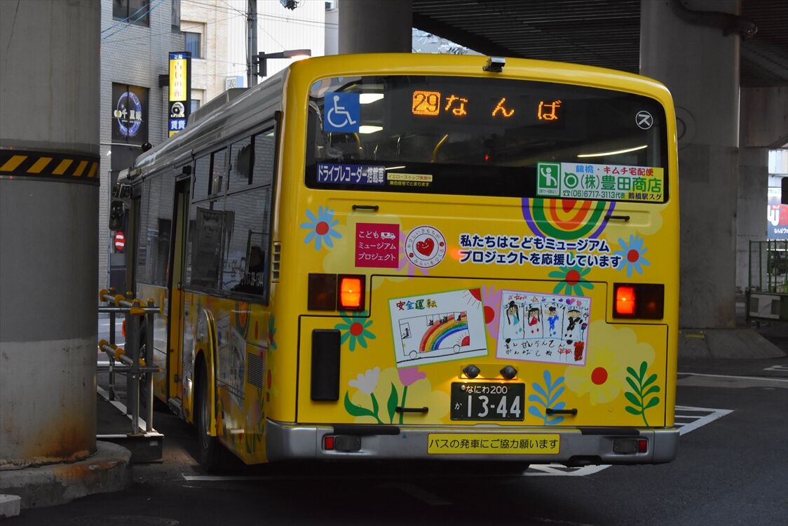 2023年12月29日 こどもミュージアムプロジェクト(大阪シティバス) カテゴリ:大阪シティバス(全ラッピング) by wrpgu 住之江の1344に、「安全運転」がテーマの、こどものイラストのラッピングバスが登場 側面は下半分のみに実施 なんばの新停留所、位置的には撮りやすくなったと思っていましたが、最近は当初なかったフェンスが増え、そうでもなくなりました ここも現在は撮影困難になりました おまけ:総務省のラッピング2台