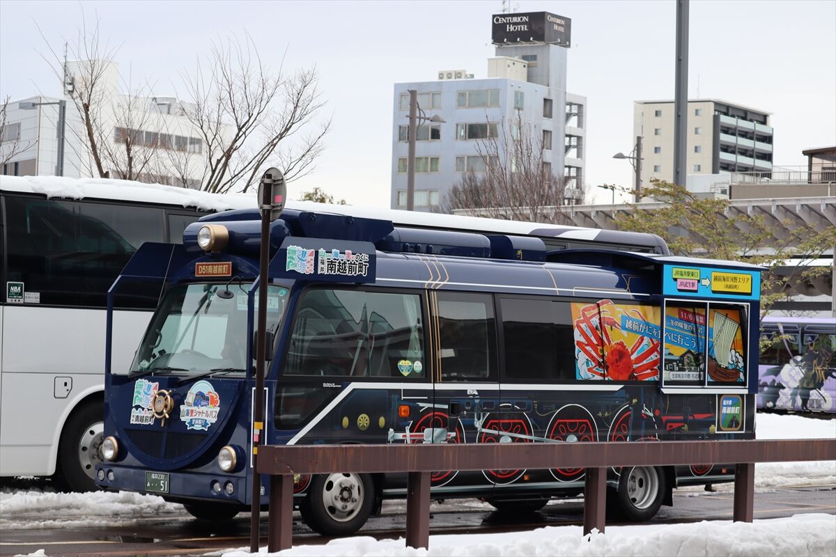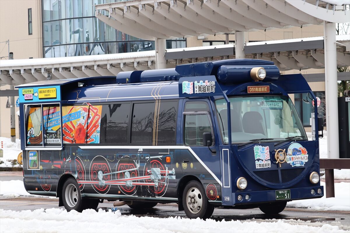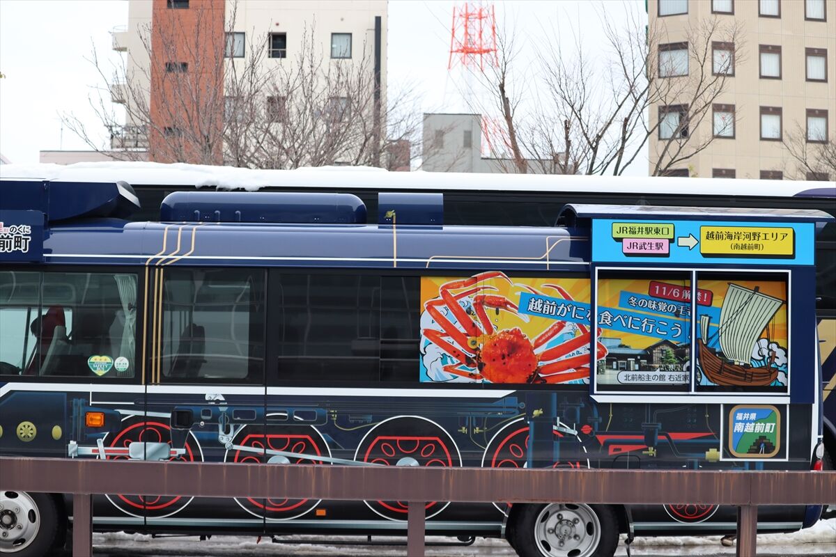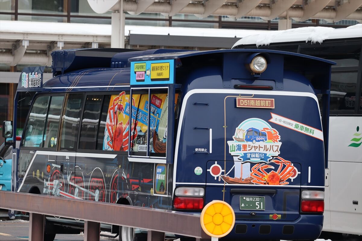 2023年12月31日 山海里シャトルバス「北前船号」(ラッピングバス) カテゴリ:北陸 ラッピング車 by wrpgu 2023年の11/11~12/24、福井駅~南越前町の無料シャトルバスが2往復運行 SLをイメージした車両にカニなどもラッピング (2023/12)