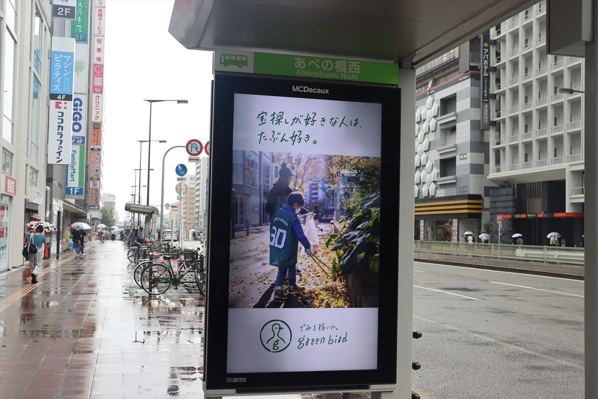 あべの橋で、バス停広告がデジタル式になっているのを発見
