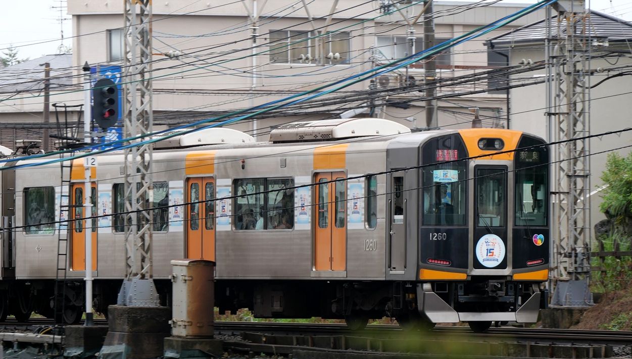 ヘッドマークと側面のステッカーが掲出され、阪神電車は大型