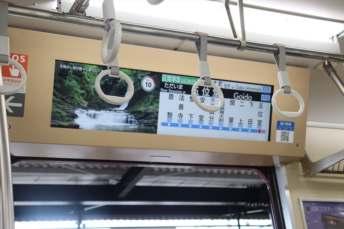近鉄ではほとんどなかった車内モニタも増えてきて、最近はかなりの大型が搭載