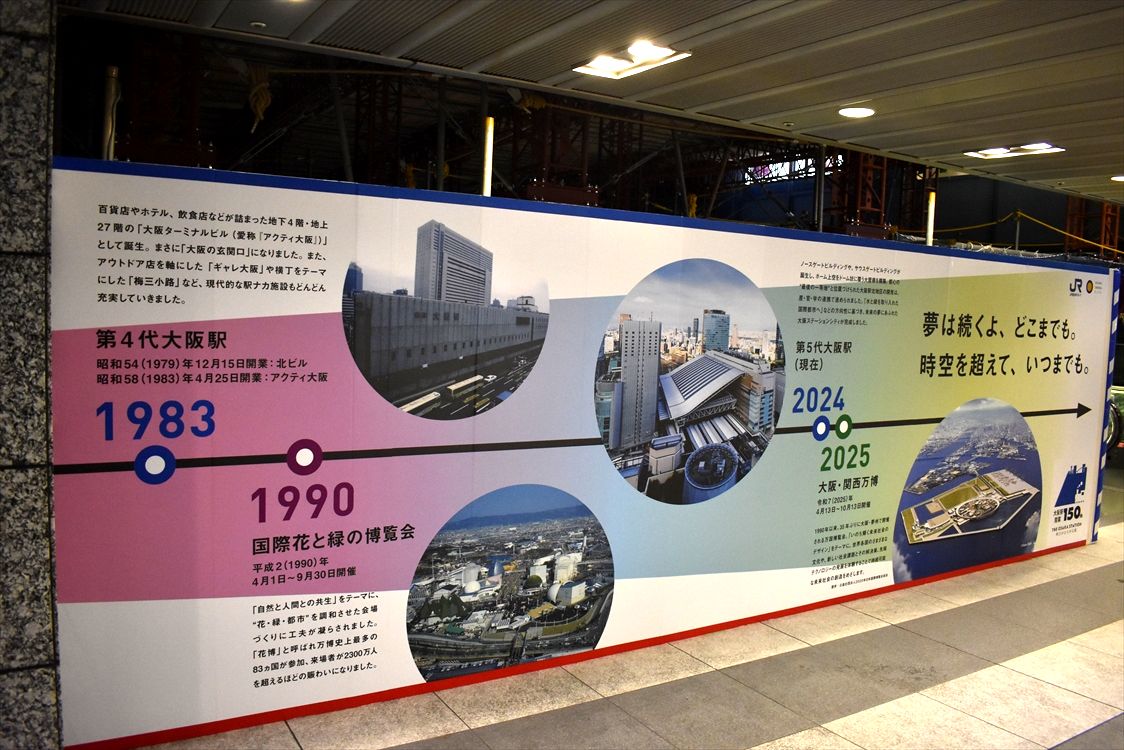 JR大阪駅中央の2Fデッキの工事フェンスに、大阪駅&大阪での万博の歩みのラッピングが登場