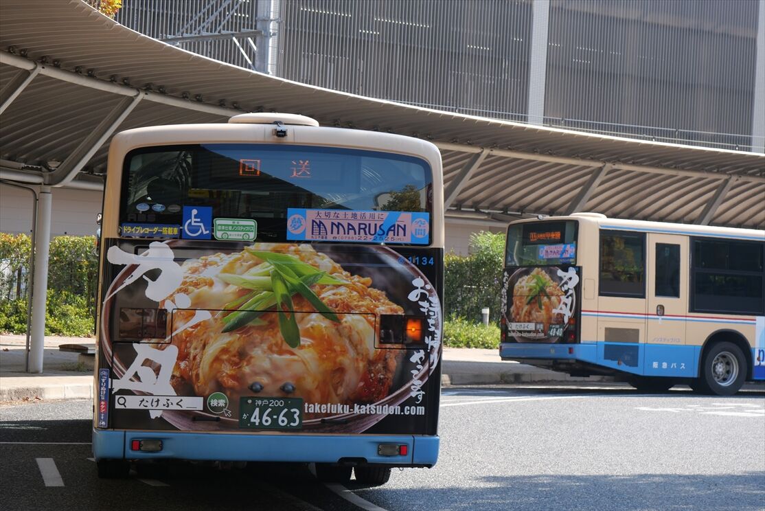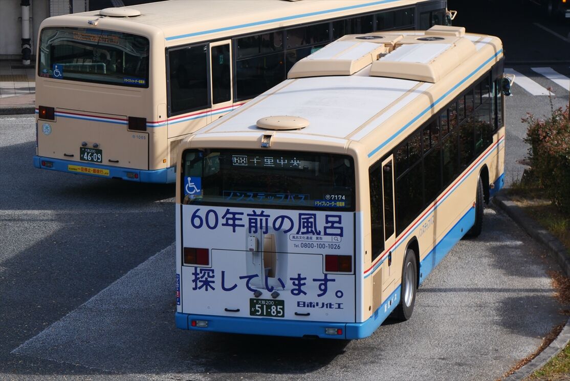 2025年11月29日 ◆日ポリ加工(阪急バス)7174 カテゴリ:阪急バス(千里営業所) by wrpgu 先日、3035号車の同リアラッピングバスを載せましたが、7174号車にも同じのがありました 車種の違いで、少々デザイン違い ちょうど3035とも並びました おまけ:トーヨータイヤの広告 (2025/11)