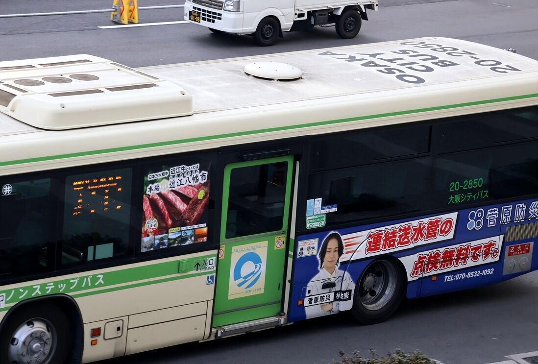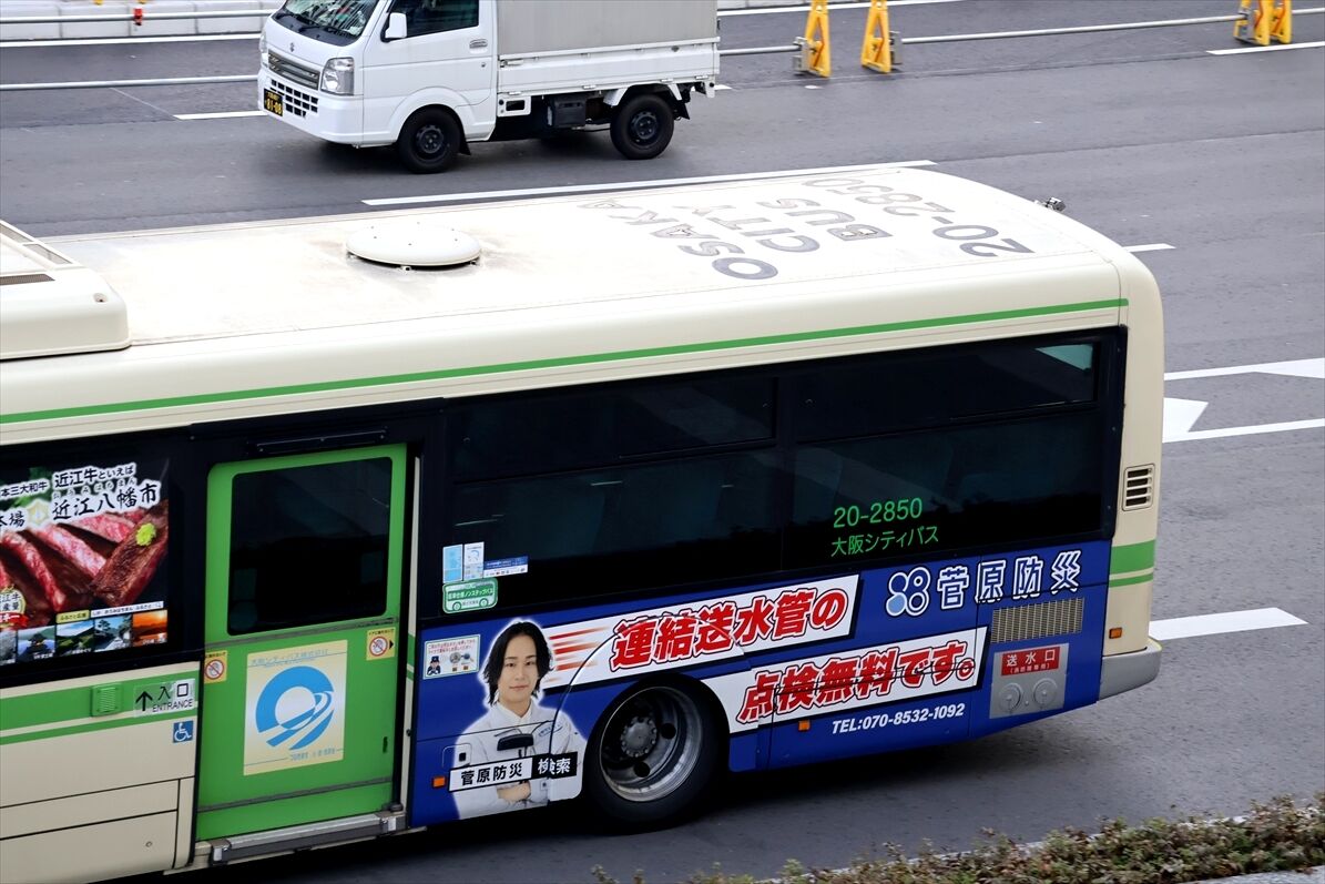 2026年02月15日 ▽菅原防災(大阪シティバス) カテゴリ:大阪シティバス(左面ラッピング) by wrpgu 井高野2850、長寿園の左面ラッピングが終了し、菅原防災のラッピングに変更 (2026/2)