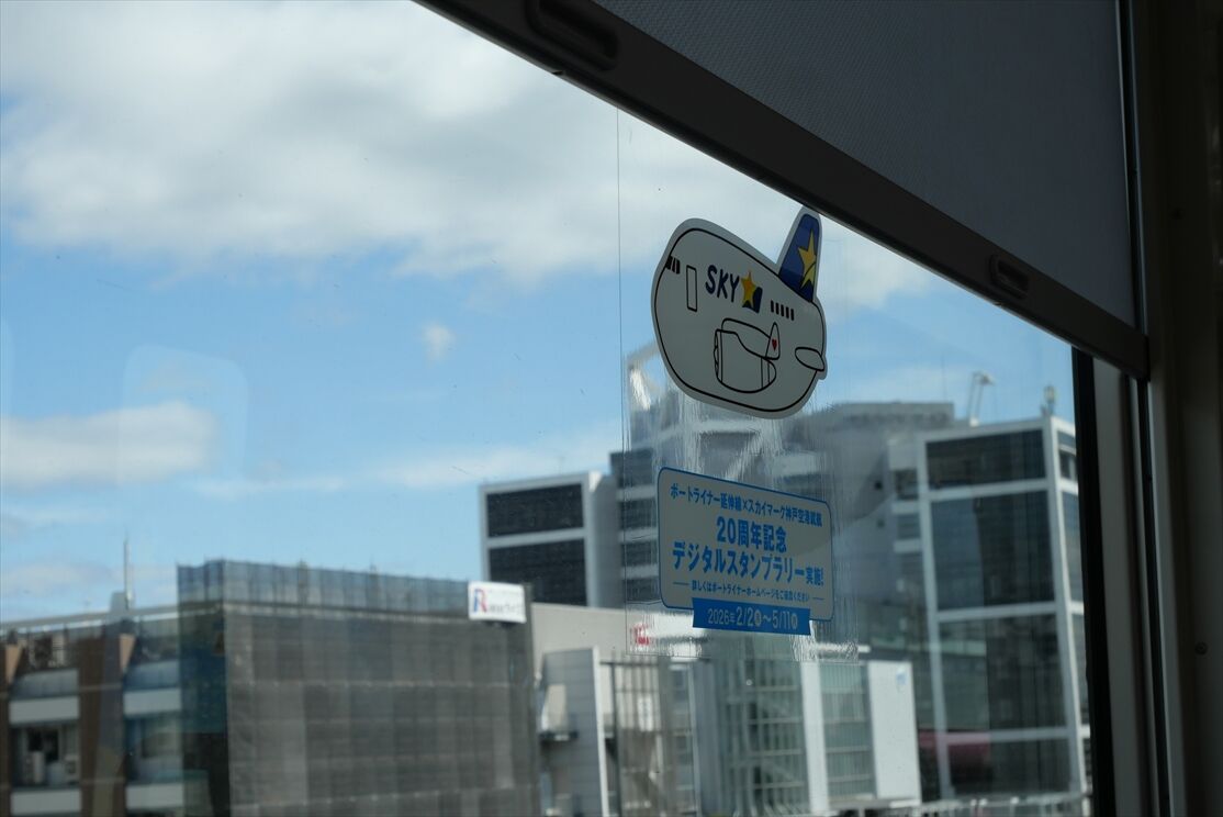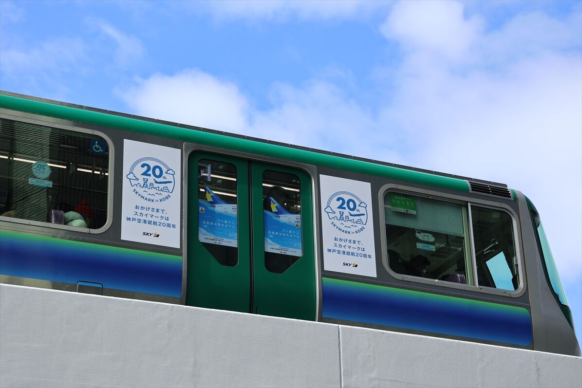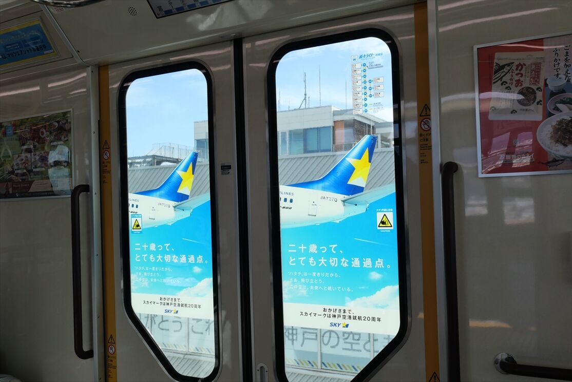2026年03月15日 スカイマーク×神戸空港(ポートライナー) カテゴリ:兵庫県 ラッピング車 by wrpgu ポートライナーで、空港延伸線開業20周年のヘッドマークがついていました で、たまたま乗った21編成は・・・ スカイマークとのタイアップのラッピングがついていました(先頭2両のみ) ドアのラッピングは、車内からのみちゃんと読める感じ 窓には2種類のステッカーが (2026/3)