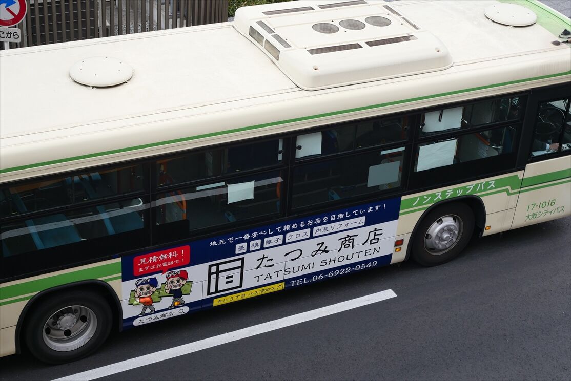 守口で昨年から、たつみ商店の左面ラッピングバスが走っていますが、最近、右面ラッピングバスが増車されました