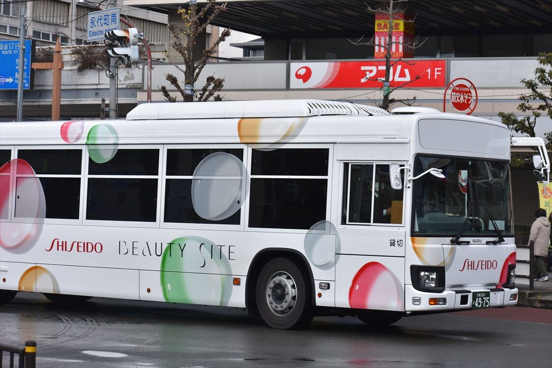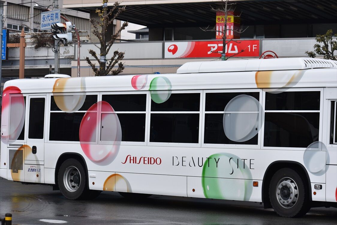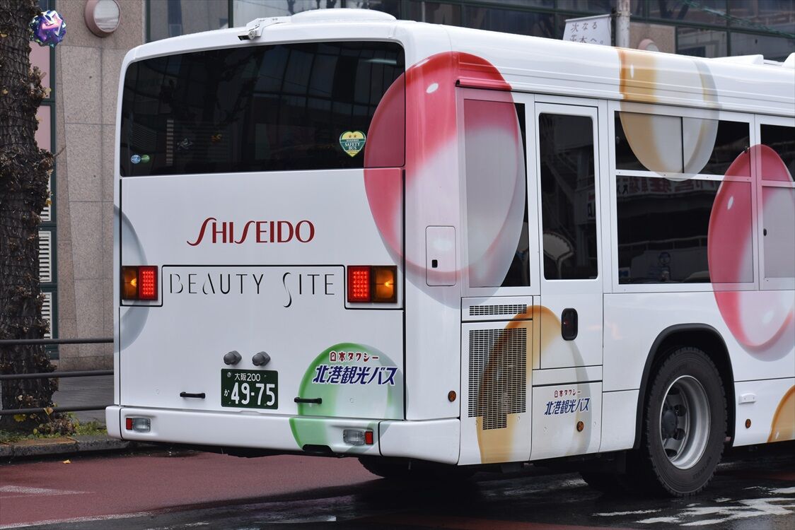 茨木で見かけた、資生堂の送迎バス。北港観光バスの新車が入ったというのは知っていましたが、ラッピングが施されていました