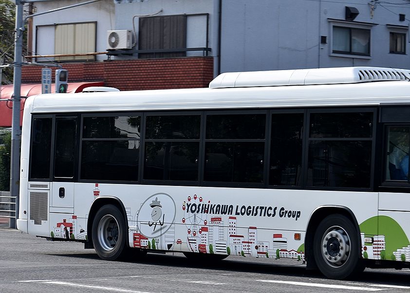 2022年09月18日 吉川運輸(送迎バス) カテゴリ:大阪府 ラッピングバス〇企業・住居向け送迎バス by wrpgu 大阪の住之江区で見かけた、吉川運輸のたぶん従業員用バス 側面はイラストをラッピング、阪堺電車の広告のと一部似たような雰囲気のデザイン