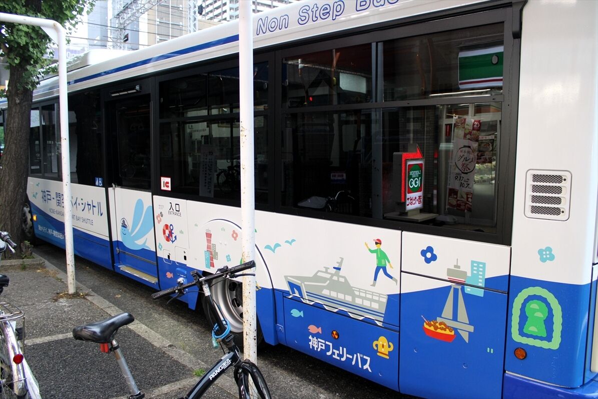 御影で見かけた、神戸フェリーバスの元町商店街のラッピングバス