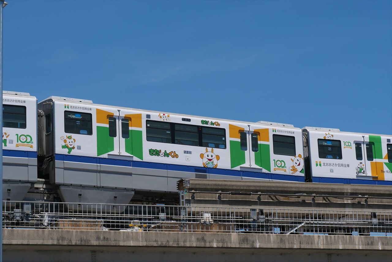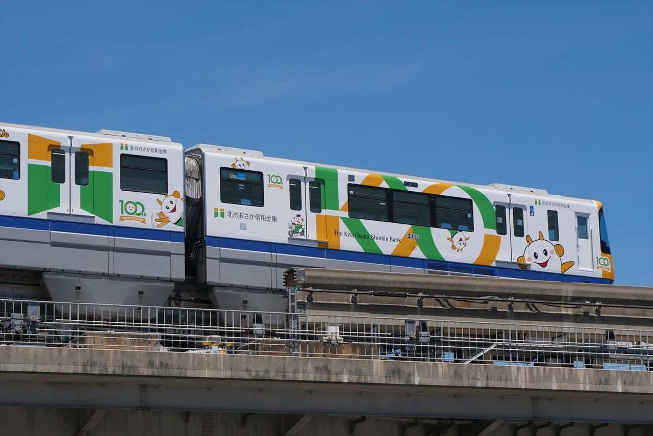 2024年07月08日 北おおさか信用金庫(大阪モノレール) カテゴリ:大阪モノレール by wrpgu 先月、車庫にいる北おおさか信用金庫のラッピング編成をちょっと載せましたが、走行の姿を見られました それぞれの車両でデザイン違い (2024/7)