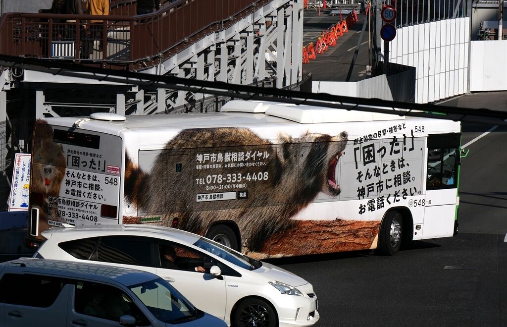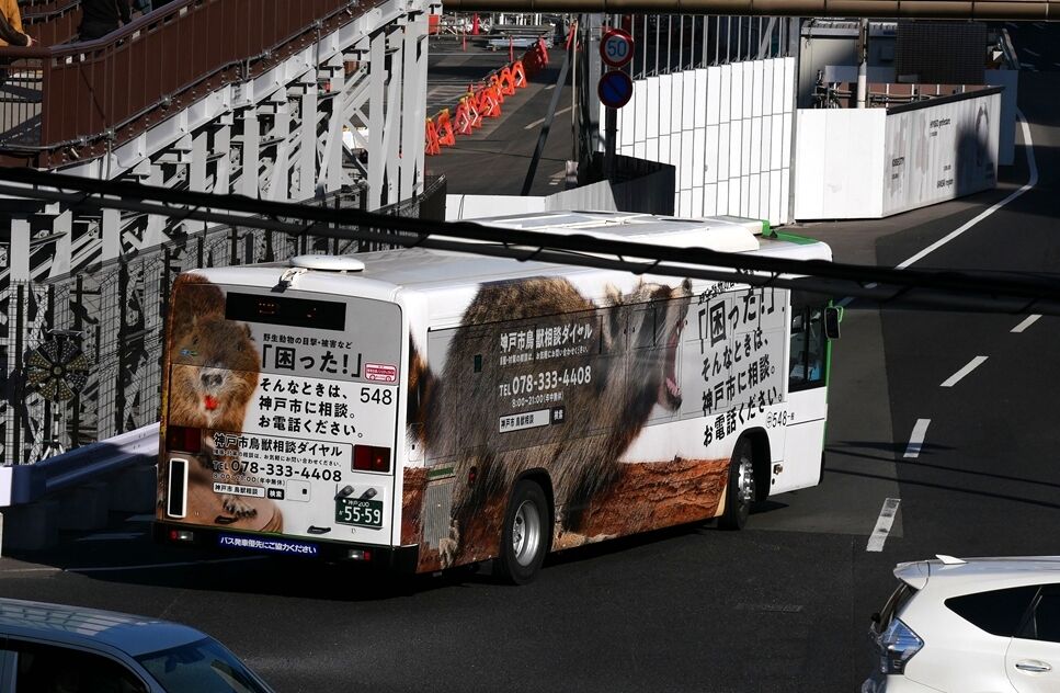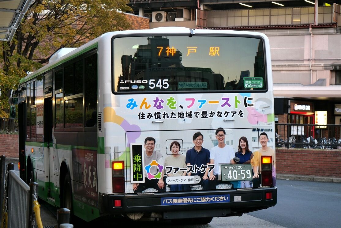 基本的に西神のと同じデザインですが、最近神戸市バスでは前方もラッピングされることになったので、この車両もデザイン拡大しています