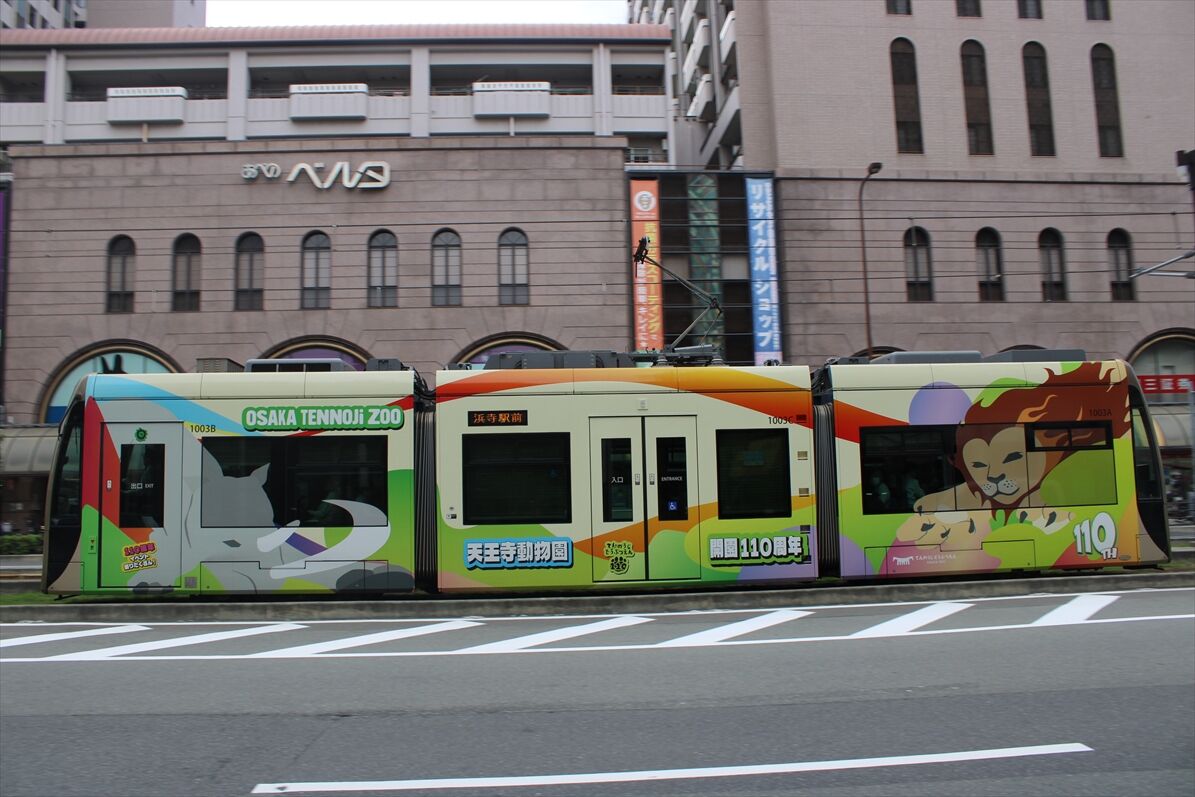 2025年05月08日 天王寺動物園(阪堺電車) カテゴリ:阪堺電車 by wrpgu 3月から、阪堺のトラム1003に、天王寺動物園のラッピングが施されました 3月下旬にすんなり撮れたんですが、反対側は違うデザインとのこと。そちらも撮ってから載せようと思っていたけど、なかなか遭遇できず・・・(3本運行時もお休みのこと多々) とりあえず、海側の面だけ載せます (2025/3) おまけ:こっちのラッピング車はよく見かける、近畿大学号