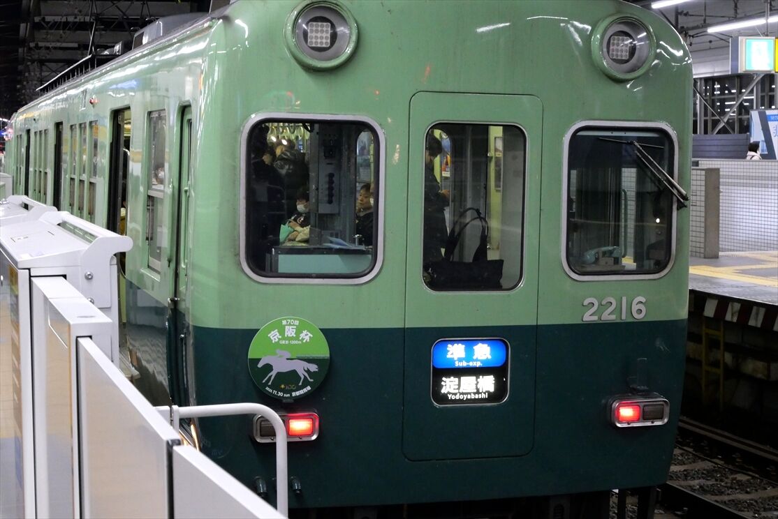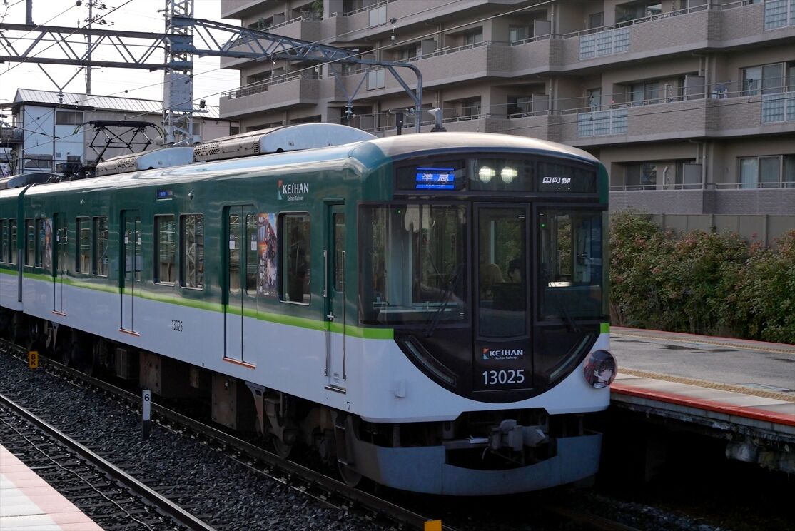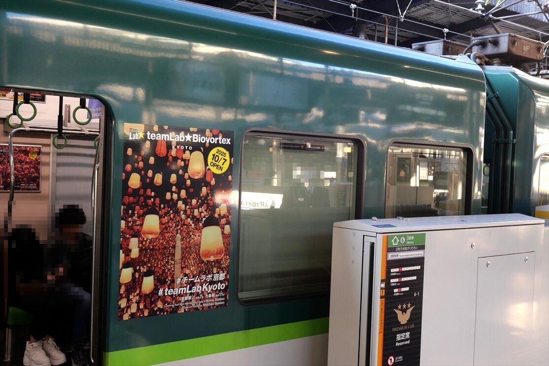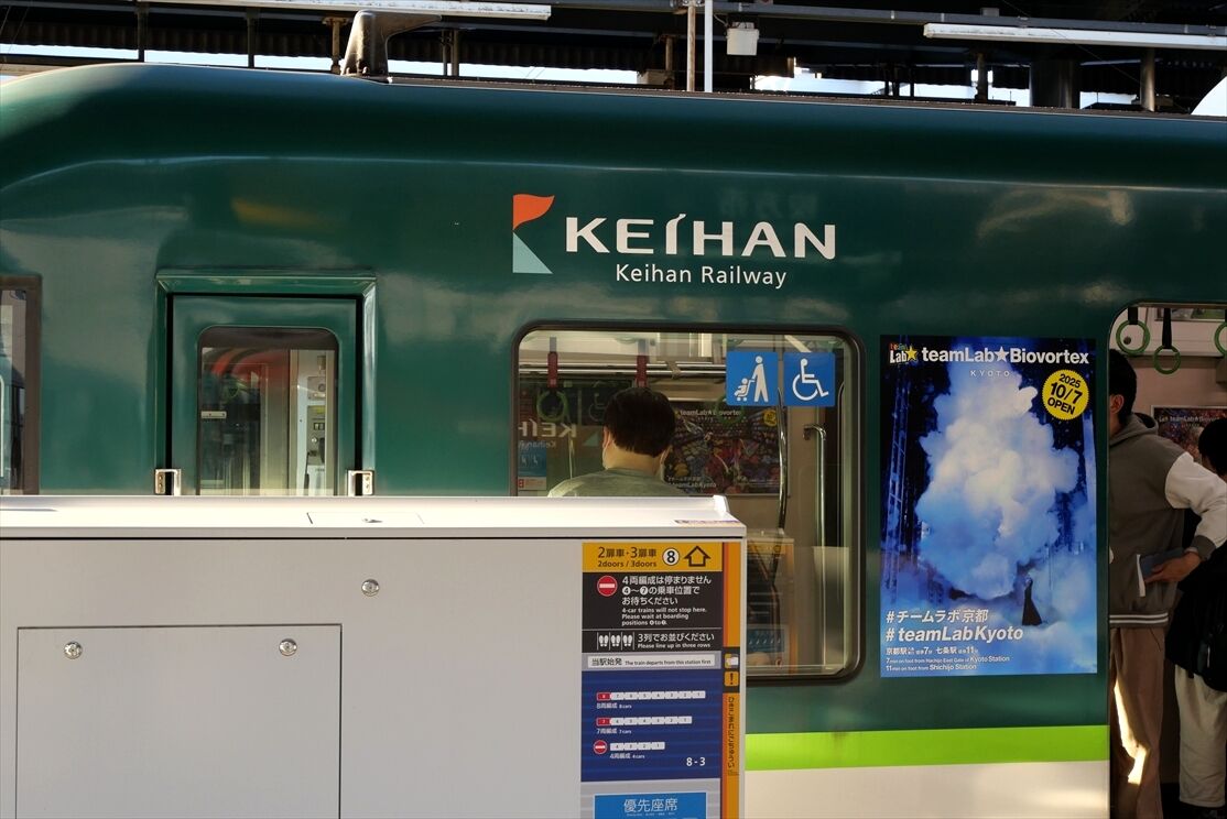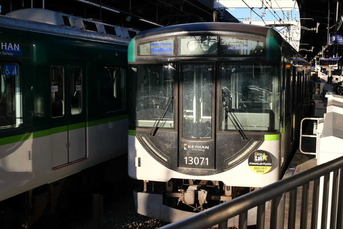 2025年12月01日 teamLabKYOTO(京阪電車)ほか カテゴリ:京阪電車 by wrpgu 先日京阪電車に乗ったら、チームラボ京都のHM・側面ラッピング編成を見かけました 側面ラッピングは2種類ずつ おまけ:もみじHM 京都競馬場 京阪杯HMも見かけました これ撮ってたら隣に臨時特急中之島行きが 京阪枚方市駅、足元の乗車位置シートがすごい (2025/11)