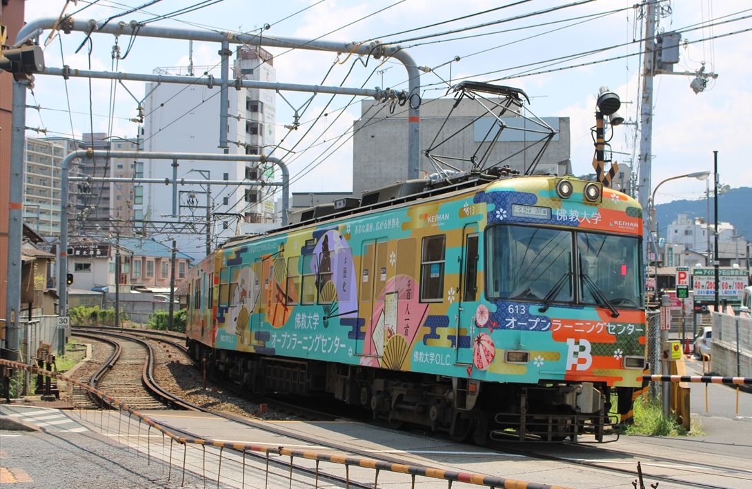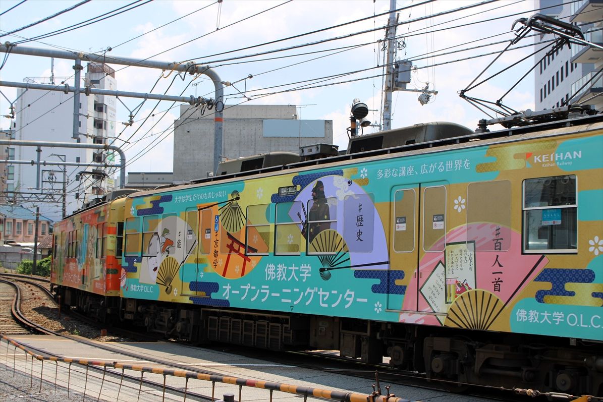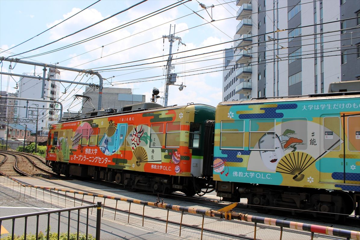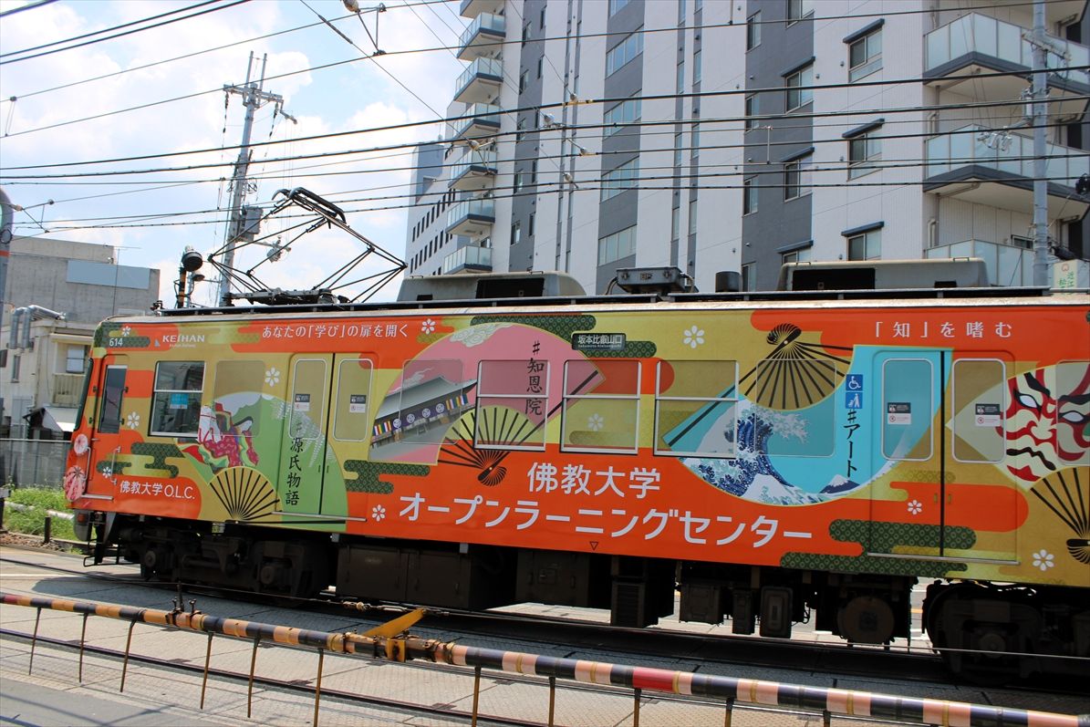 2025年08月05日 佛教大学(京阪大津線) カテゴリ:京阪電車 by wrpgu 大津線の佛教大学のラッピング、いつの間にかデザイン変更されていました 以前は赤・紫のデザインでした (2025/8)