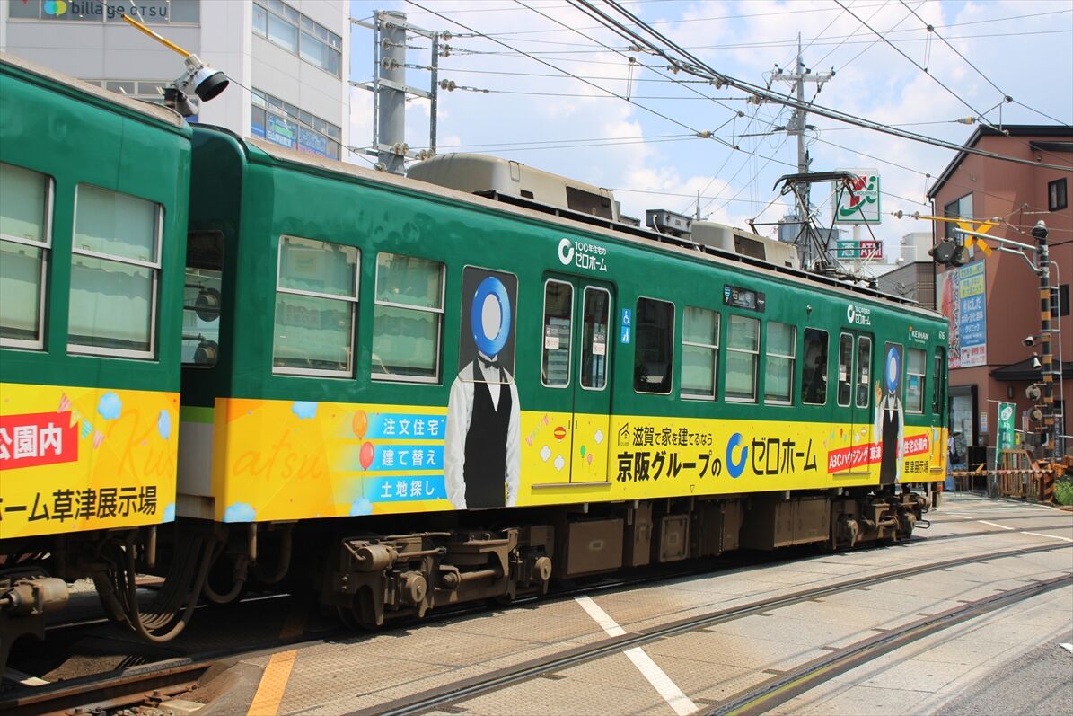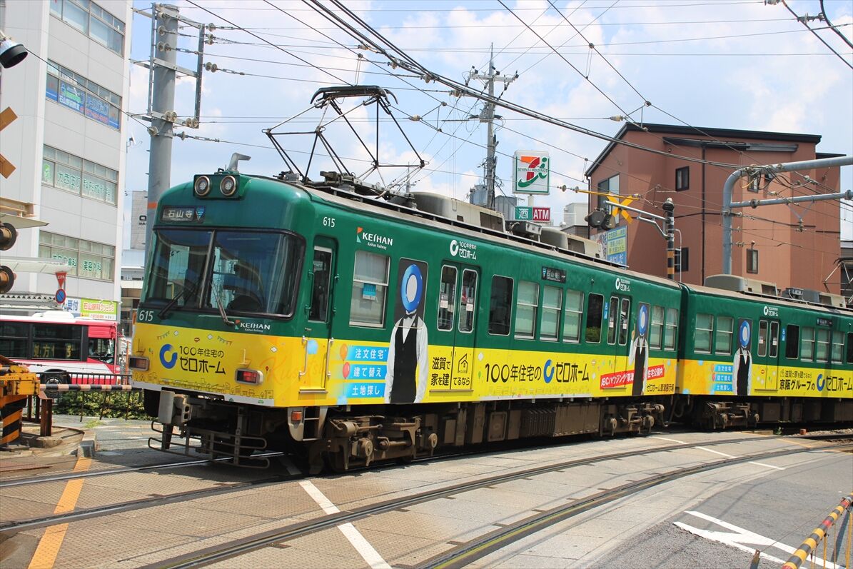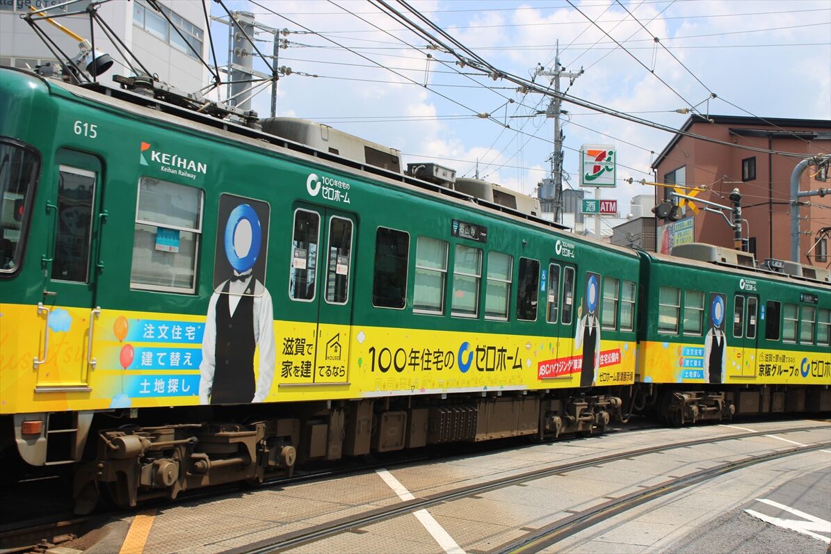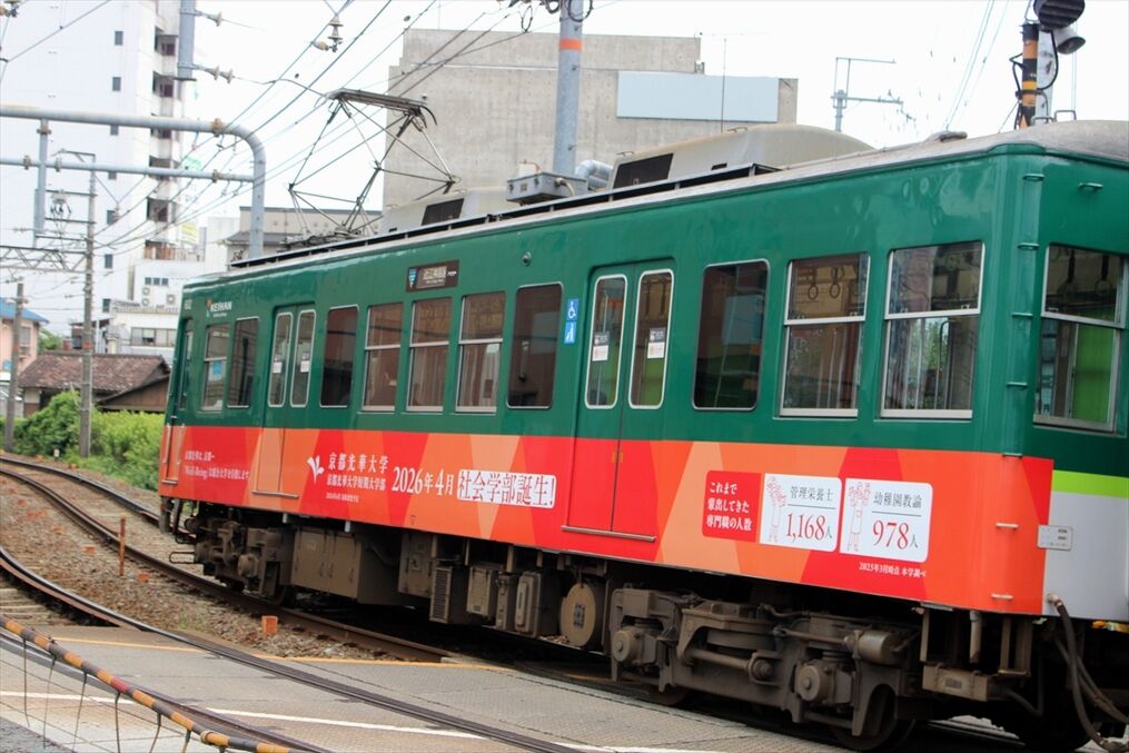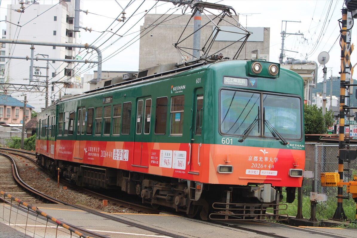 2025年08月05日 佛教大学(京阪大津線) カテゴリ:京阪電車 by wrpgu 大津線の佛教大学のラッピング、いつの間にかデザイン変更されていました 以前は赤・紫のデザインでした (2025/8)