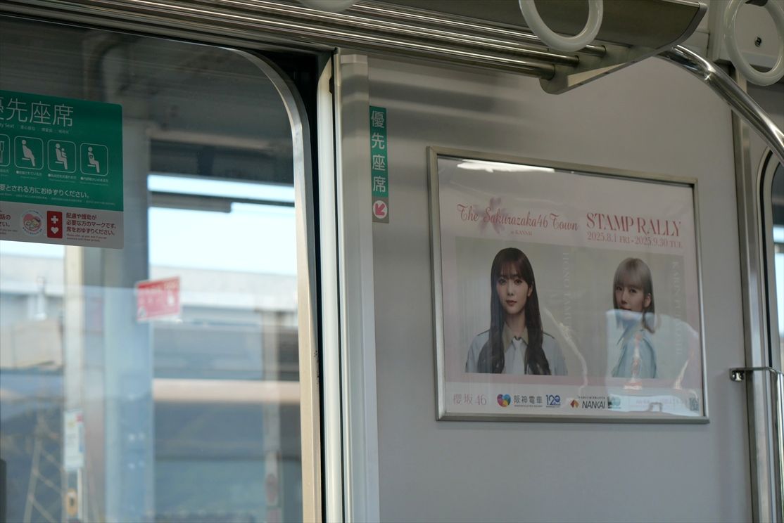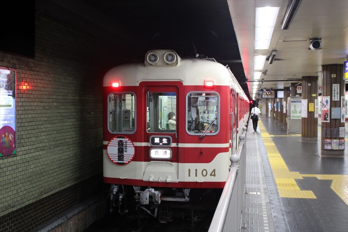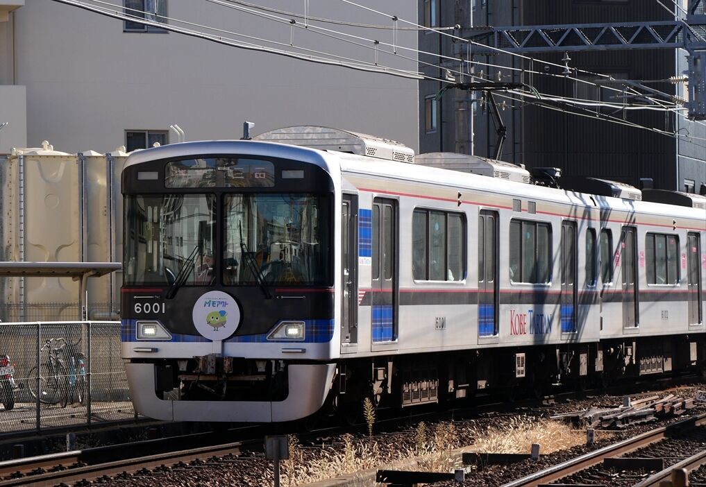 神戸電鉄で、モアクト(関西電力関連)のヘッドマークと、チェック柄の神戸タータンのラッピングをした列車が走っています