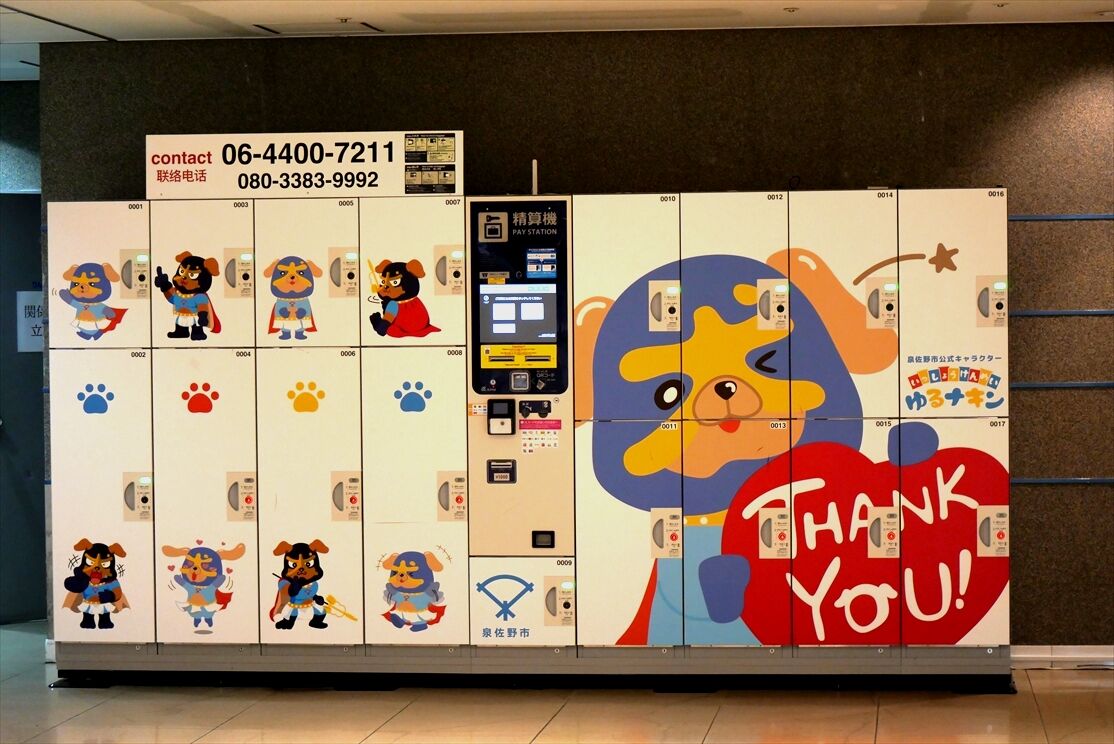 りんくうタウン駅にある、泉佐野ラッピングロッカー、これまで、泉州タオルなどのデザインでしたが、いつの間にか、「ゆるナキン」という可愛いやつになったのと、観光PRのに変更されていました
