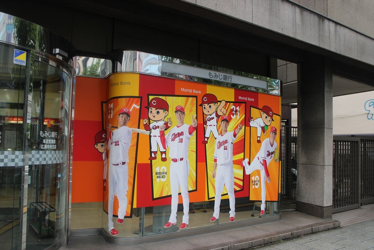 2025年10月27日 広島カープ×もみじ銀行本店 カテゴリ:■建物・施設へのラッピング等 by wrpgu 胡町の、もみじ銀行本店、広島カープの装飾がされていました これだけかと思ったけど、遠目で見たら スラィリーという、これもカープのキャラクターだそうで これ、今夏からのデザインだそうで、以前はカープ坊やだったみたい (2025/9)
