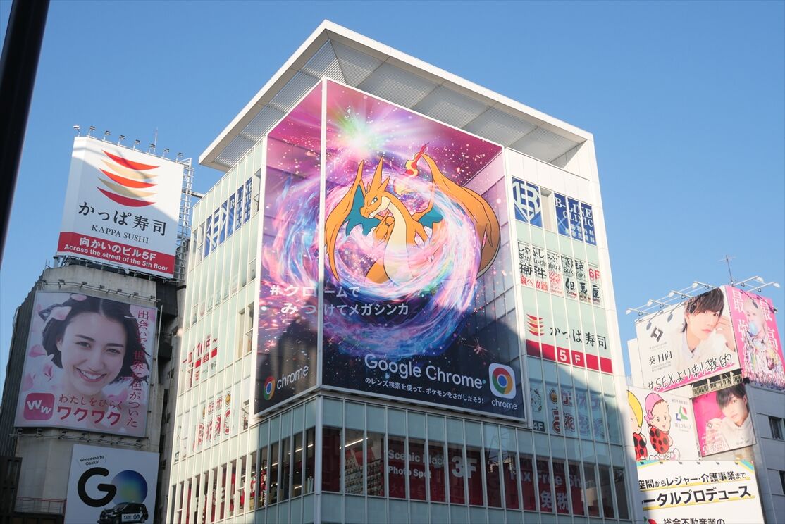 ・道頓堀、Googlechromeとポケモンの看板、なんか立体的に見えるデザイン