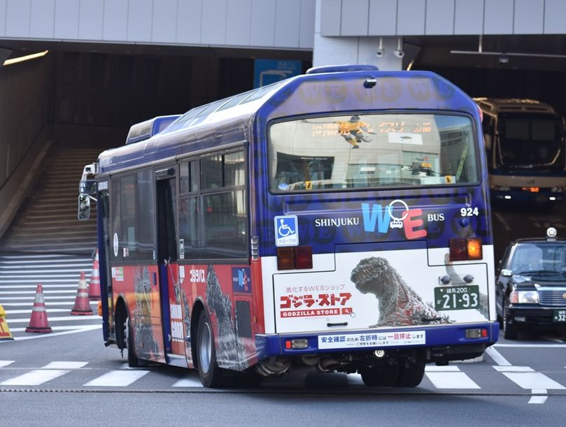 2019年11月03日 ゴジラバス(京王バス) カテゴリ:京王・西東京バス by wrpgu 新宿の循環バス、2016年夏から運行しているゴジラのラッピングバス、まだ走っていました 以前のと、ほんの少しデザイン変わっていました(後部のゴジラストアとか) ちなみに11/3は、1954年に東宝の怪獣映画「ゴジラ」の第1作目が封切られた、ことから「ゴジラの日」
