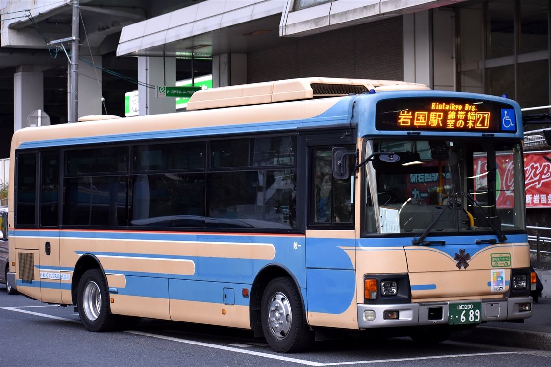 2022年03月13日 錦川鉄道清流線、いわくにバス カテゴリ:山口県 ラッピング車 by wrpgu 新岩国駅で初めて下車(初めての岩国) 思った以上に・・・何もない・・・ マンホールもない バスも普通のしかいない 次の新幹線まで数十分・・・ 駅の案内で、錦川鉄道のりばこちら、という案内が そんな鉄道があるの?? どうやら間もなく列車が来るようなので、ちょっと見てみよう すると カラフルな列車がきました。自然を描いた4両があるようで、そのうちの2両が連結されていました ちょっと遠目でしたが、見れてよかった 時間がまだ余って・・・ 錦帯橋までは行けなかったので、模型で堪能